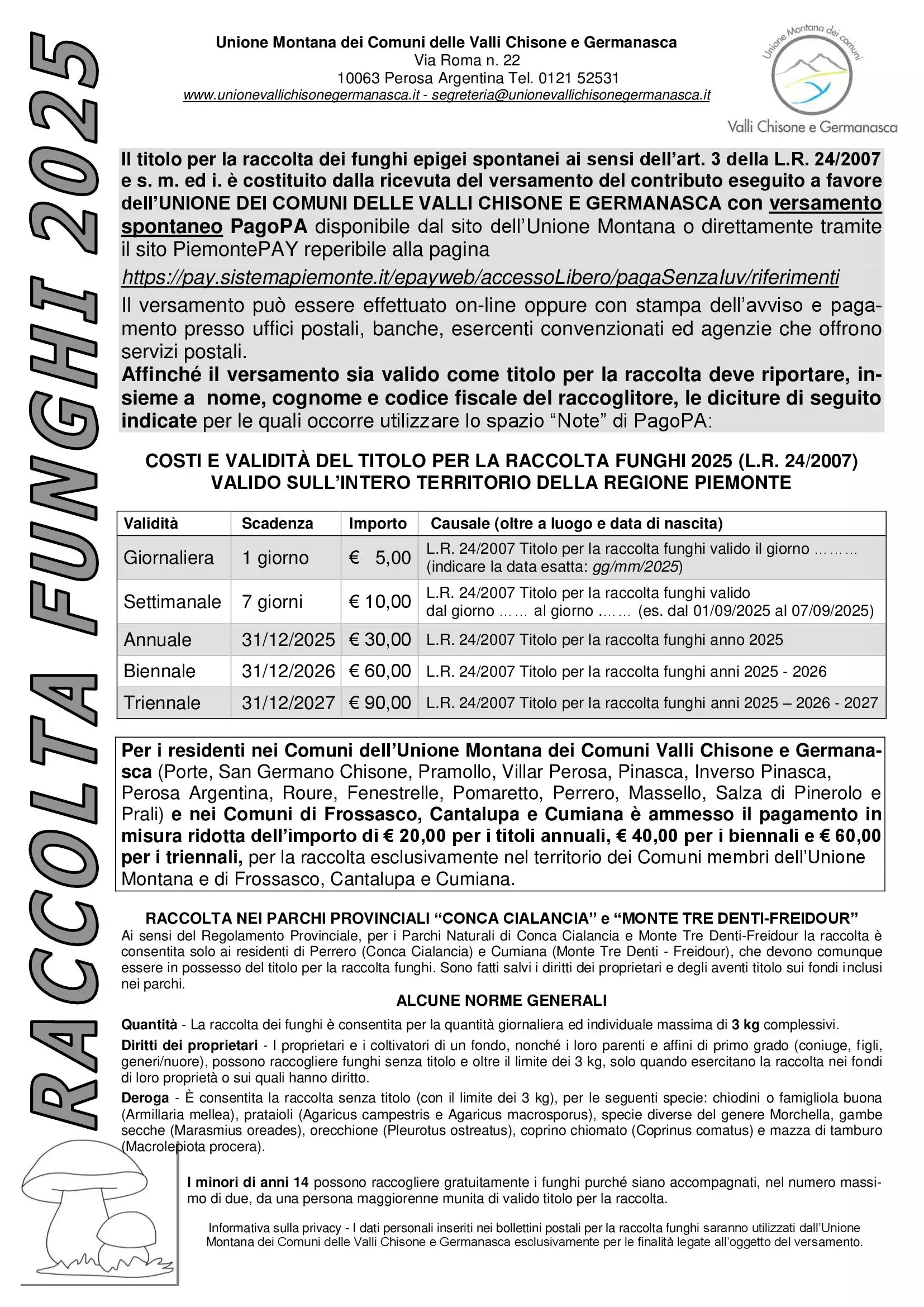 Il titolo per la raccolta dei funghi epigei spontanei ai sensi dell’art. 3 della L.R. 24/2007 e s. m. ed i. è costituito dalla ricevuta del versamento del contributo eseguito a favore dell’UNIONE DEI COMUNI DELLE VALLI CHISONE E GERMANASCA con versamento spontaneo PagoPA disponibile dal sito dell’Unione Montana o direttamente tramite il sito PiemontePAY reperibile alla pagina https://pay.sistemapiemonte.it/epayweb/accessoLibero/pagaSenzaIuv/riferimenti Il versamento può essere effettuato on-line oppure con stampa dell’avviso e paga-mento presso uffici postali, banche, esercenti convenzionati ed agenzie che offrono servizi postali. Affinché il versamento sia valido come titolo per la raccolta deve riportare, in-sieme a nome, cognome e codice fiscale del raccoglitore, le diciture di indicate nella locandina per le quali occorre utilizzare lo spazio “Note” di PagoPA.