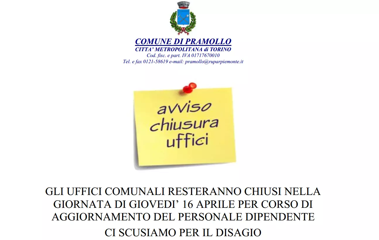 Descrizione Si avvisa l'Utenza che gli Uffici Comunali resteranno chiusi Giovedì 16 aprile per corso di aggiornamento del personale dipendente Ci scusiamo per il disagio