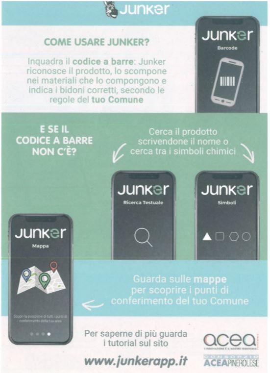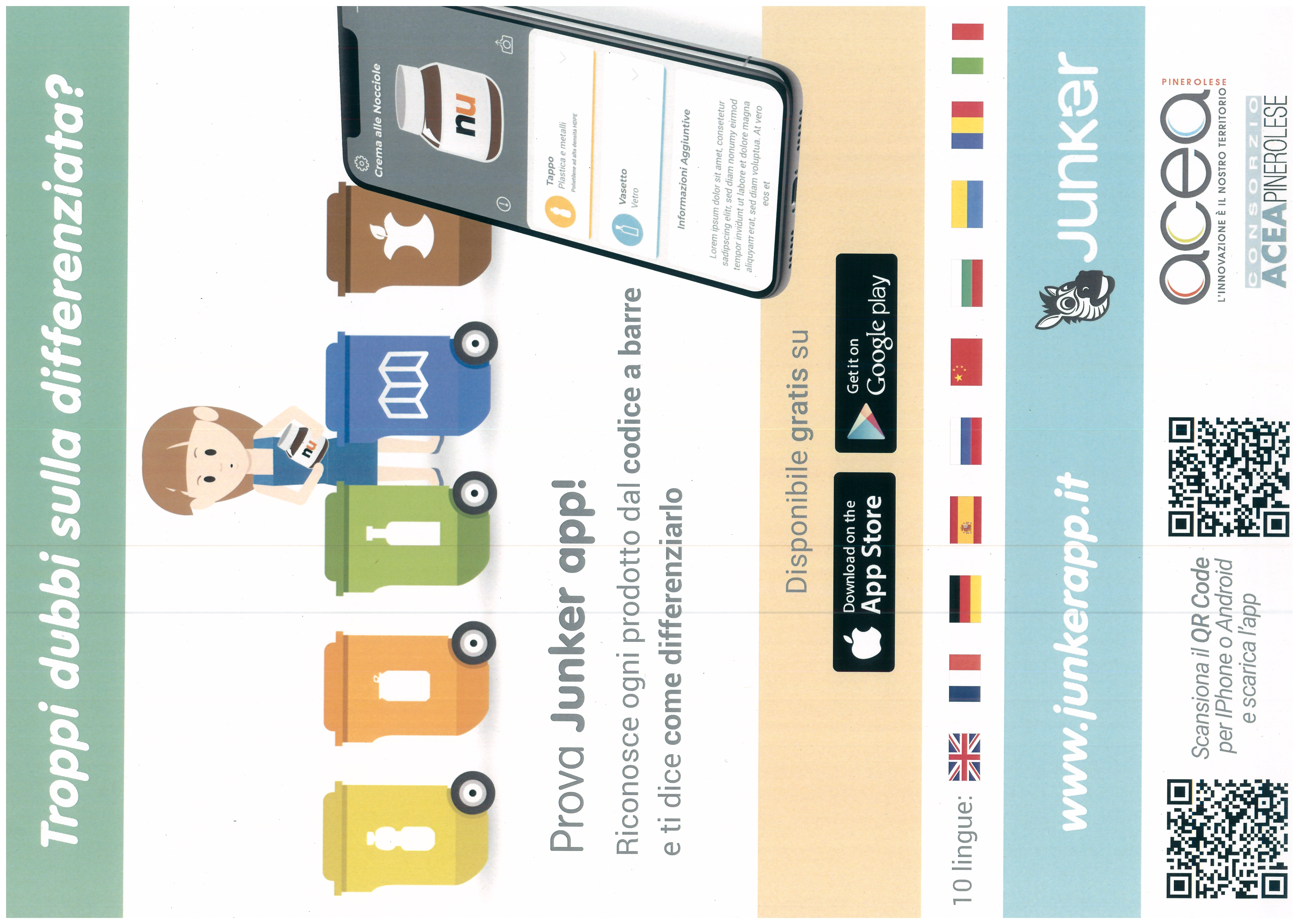 Si allega la locandina, visibile anche nelle principali bacheche del Comune e il Depliant informativo del funzionamento dell'App, scaricabile inquadrando il Qr Code dallo Store Apple o Play Store di Google, nonché dal sito www.junkerapp.it, dove è possibile reperire altre utili informazioni.