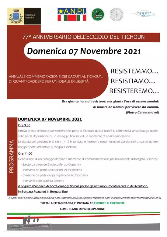 - Ore 11.00 - Deposizione omaggi floreale e momento di commemorazione presso la lapide di Borgata Pellenchi con orazioni ufficiali