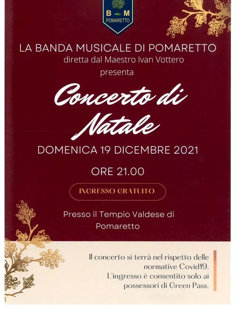 Si informa la popolazione che il 19.12.2021 alle ore 21 presso il Tempio Valdese di Pomaretto avrà luogo il tradizionale Concerto di Natale della Banda Musicale di Pomaretto.