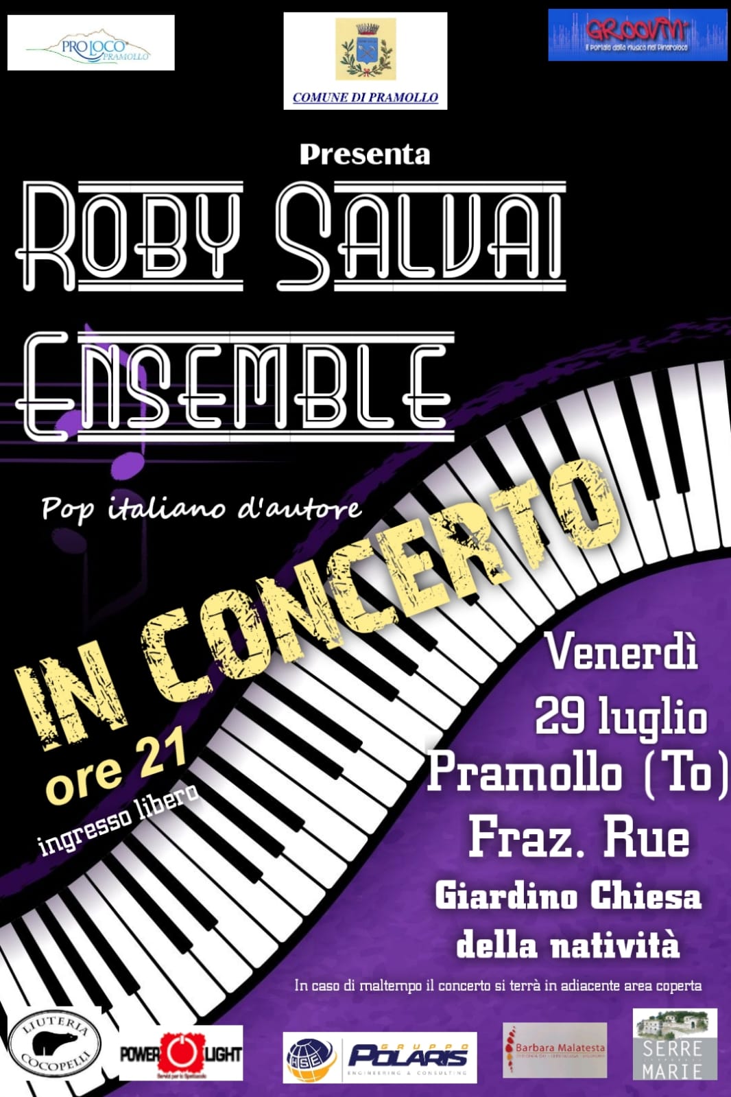 Descrizione per Venerdì 29 luglio, la Pro Loco di Pramollo ha organizzato un concerto pop nel piazzale della Chiesa della Natività.Ad esibirsi Roby Salvai e la sua Ensamble che proporrà le sue canzoni pop d'autoreAccorrete numerosi