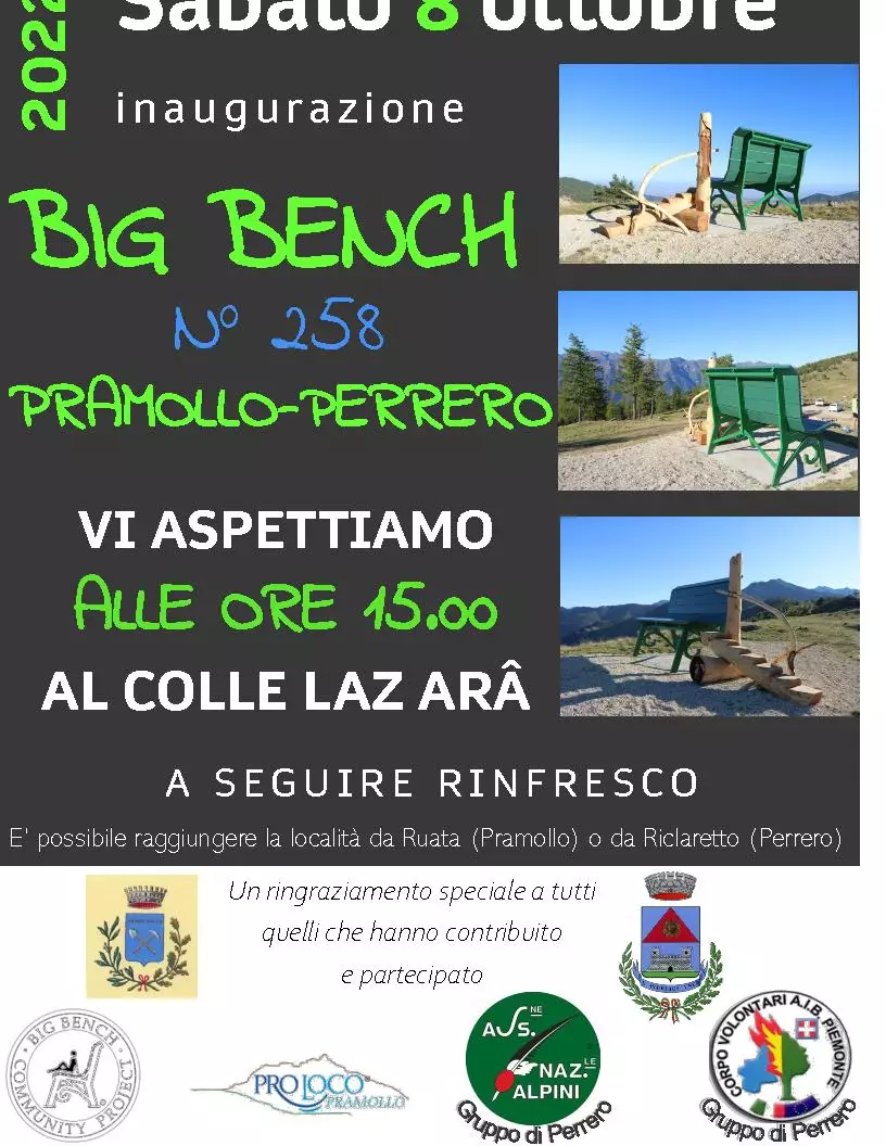 Descrizione Si rende noto che per Sabato 8 ottobre è prevista l'inaugurazione della Panchina Gigante di Pramollo e Perrero sul Colle Laz ArâAccorrete numerosi!!!