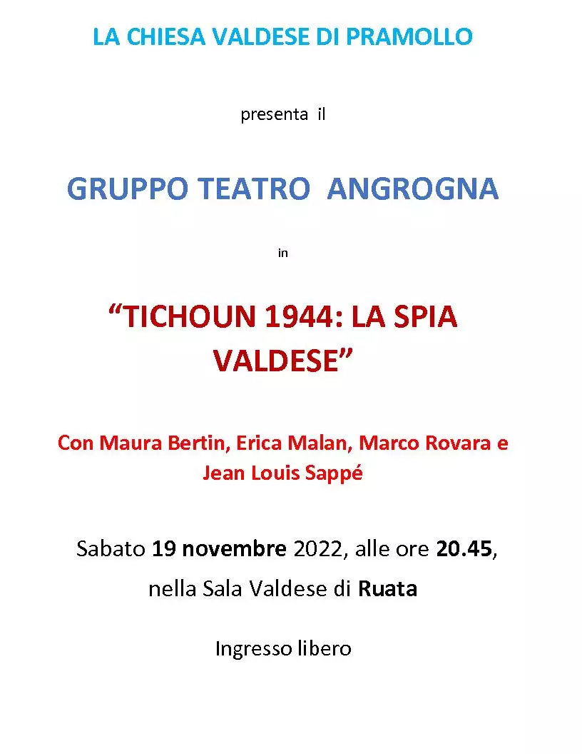 Descrizione Il Gruppo Teatro Angrogna porta in scena sabato 19 novembre l'opera dal titolo "Tichoun 1944: la spia valdese".La rappresentazione avverrà presso la Sala Valdese di Ruata.Accorrete numerosi