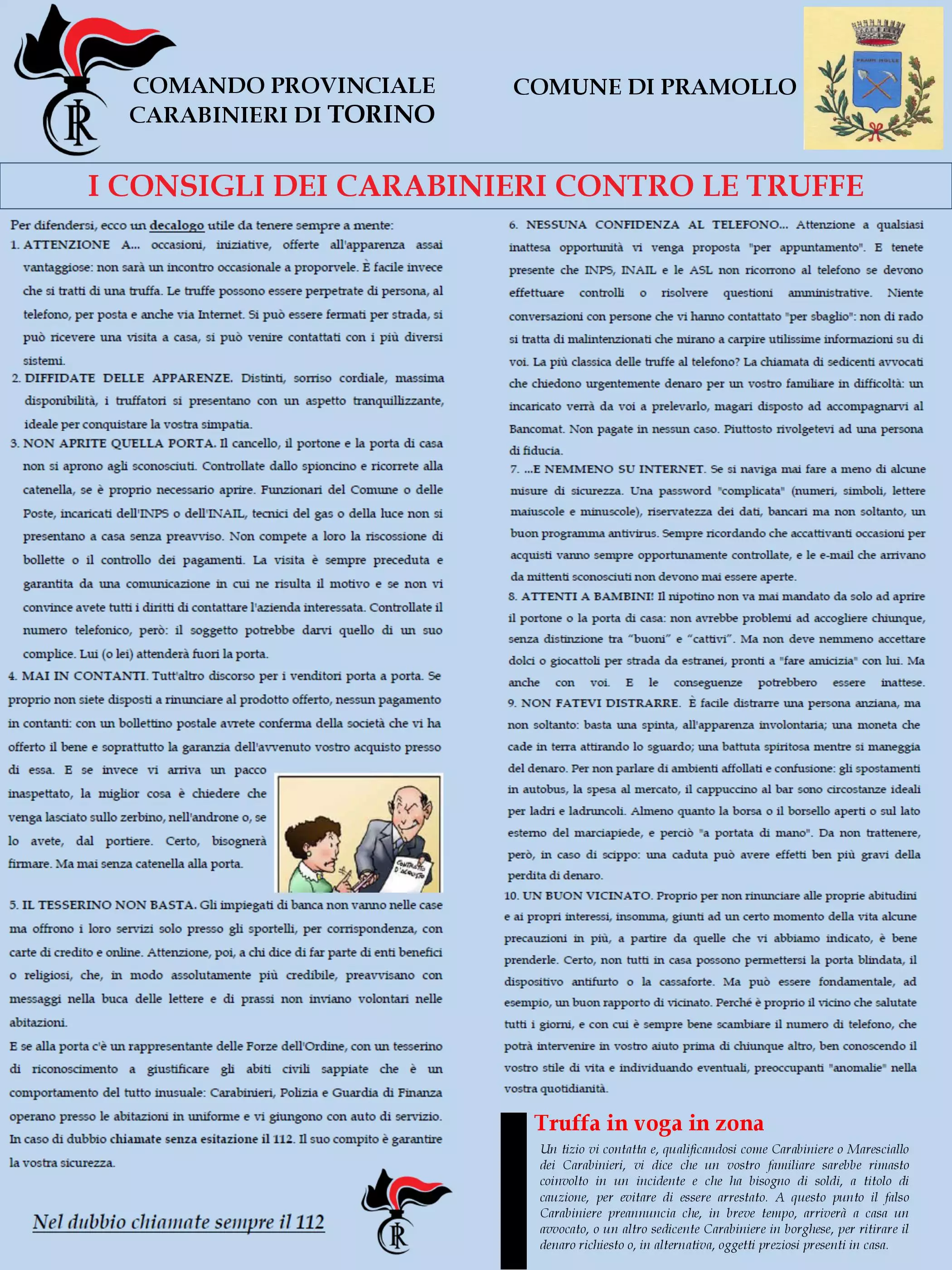 In collaborazione con la Stazione dei Carabinieri di Villar Perosa, si pubblica l'opuscolo in allegato che vuole fornire alcuni consigli utili per scongiurare spiacevoli situazioni