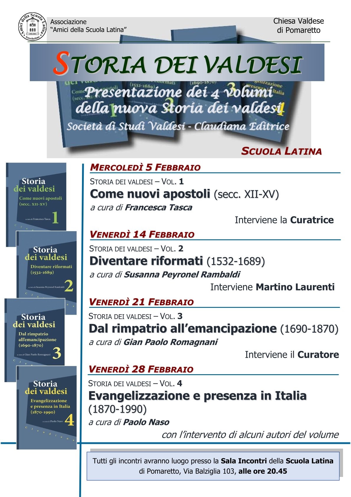Si rende noto che la scuola latina di Pomaretto, in collaborazione la chiesa valdese di Pomaretto, ha organizzato una serie di serate per la presentazione dell'opera "La storia dei Valdesi", edita da Claudiana Editore.