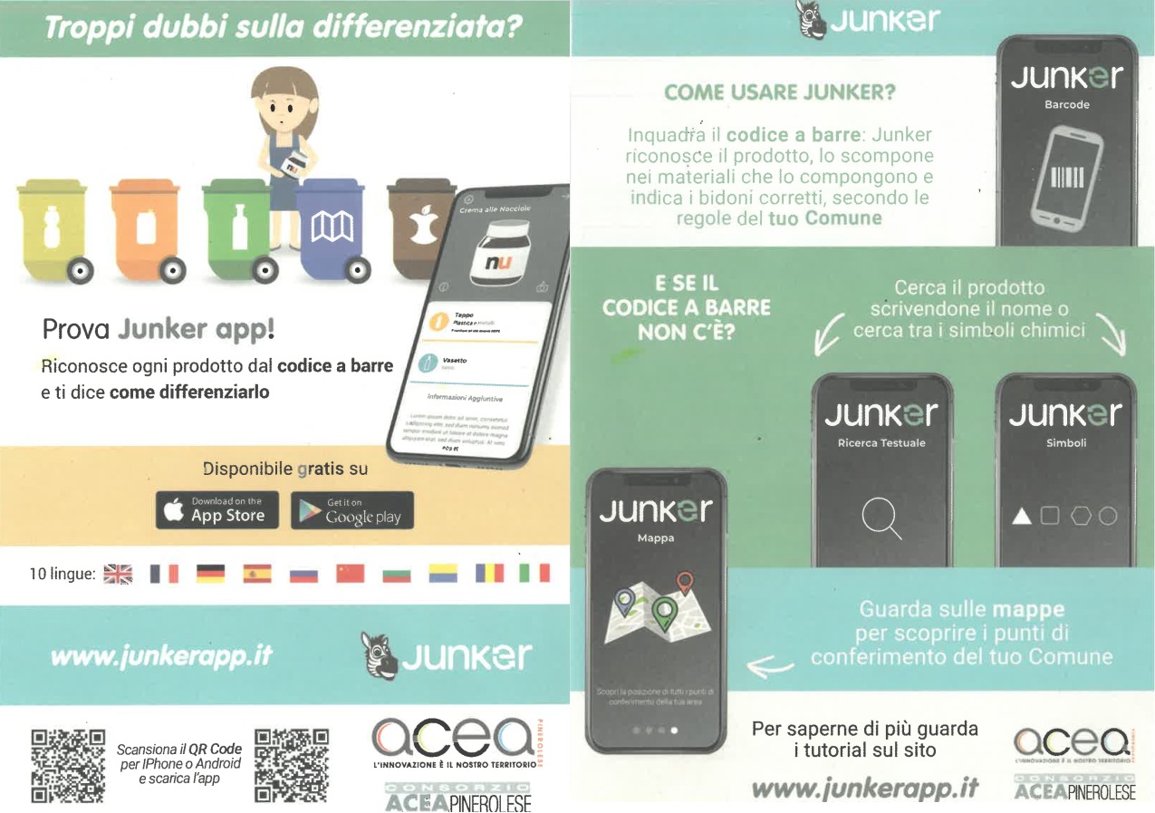 Di seguito si allegano gli avvisi presenti nelle bacheche del nostro comune, il volantino esplicativo sull'App Junker rilasciato da Acea nonché gli orari di accesso ale Ecoisole presenti nel Pinerolese e qualche link utile per essere informati circa il delicato tema della raccolta dei rifiuti.