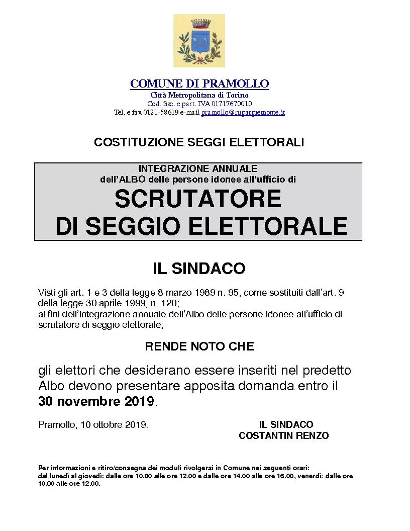 Temine scadenza della presentazione delle domande per l'iscrizione all'Albo degli Scrutatori: 30/11/2019