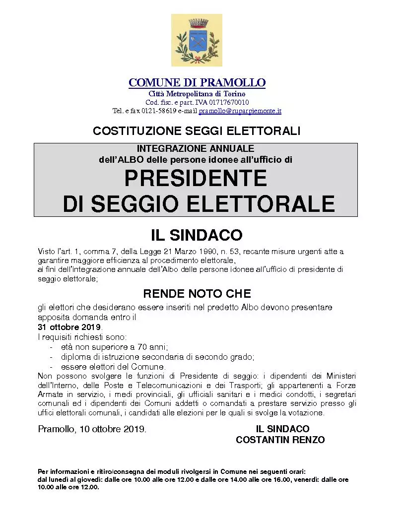 Sono aperte le iscrizioni agli albi dei Presidenti e degli Scrutatori di Seggio Elettorale.