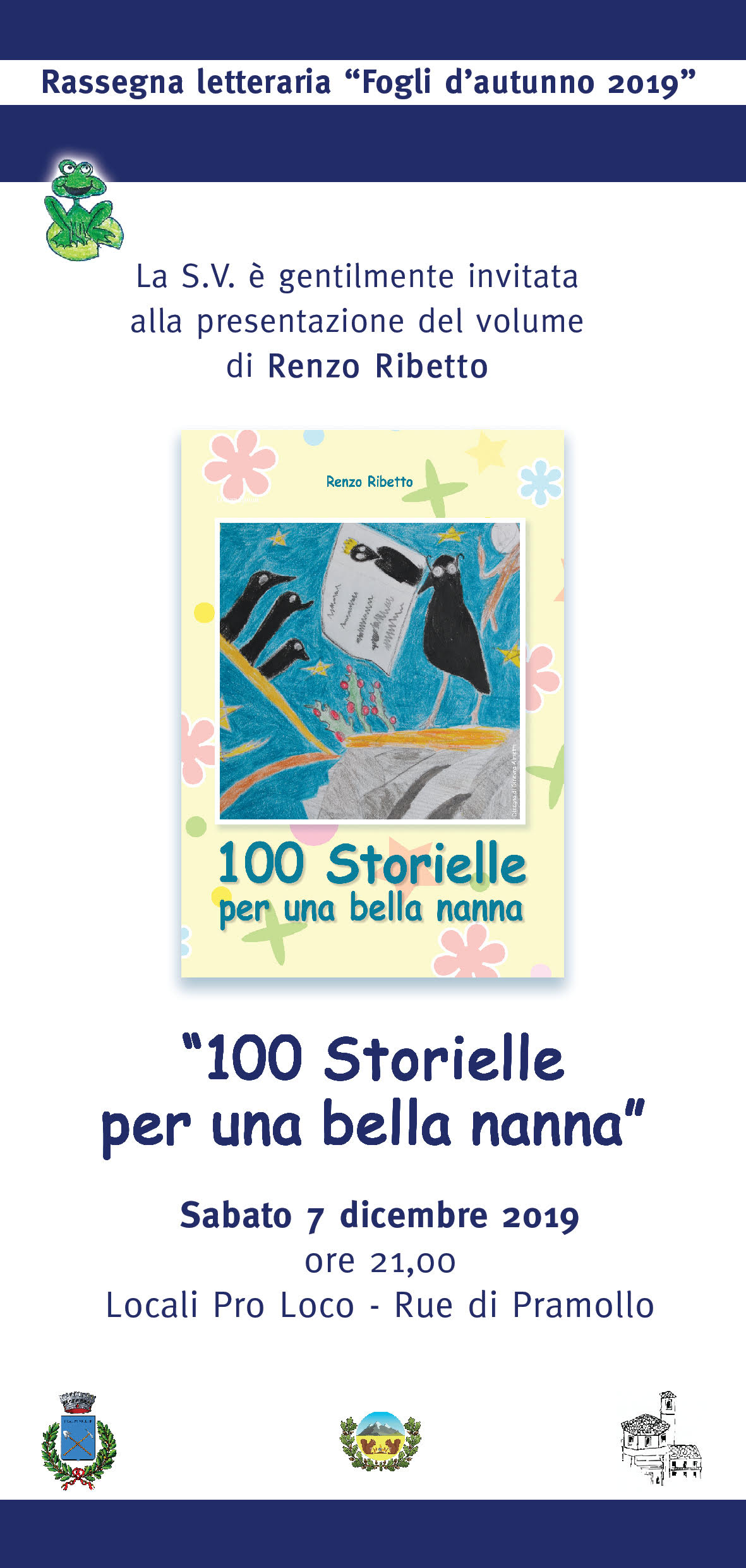 Descrizione Rassegna letteraria "Fogli d'autunno 2019"Presentazione del libro "100 Storielle per una bella nanna" di Renzo RibettoLocali Pro Loco - Rue di Pramollo7 dicembre 2019 - ore 21,00