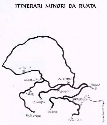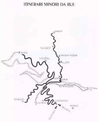 Rue (m. 719) - RUATA (m. 1130). Il primo tratto può essere percorso sia seguendo la provinciale, sia salendo verso LUSSIE e deviando a sinistra sotto il cimitero comunale delle Murise. Poco oltre il cimitero, a fianco di una fontana, si imbocca la mulattiera che sale in mezzo ai castagni (da cui il nome della zona: CIATAGNARE, passa accanto alle miniere di SIASSERA e più in alto a fianco del cimitero di Ruata e degli impianti sportivi, prima di giungere sul piazzale della Chiesa Valdese.